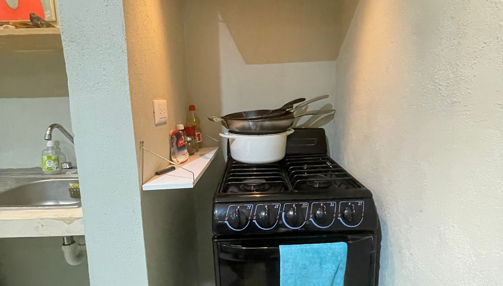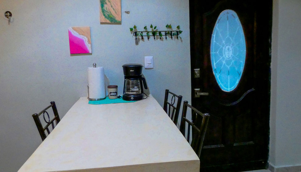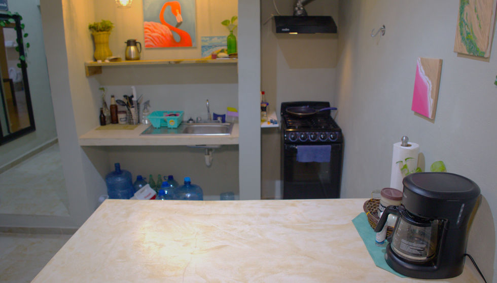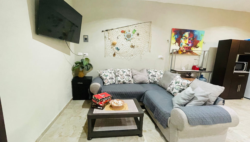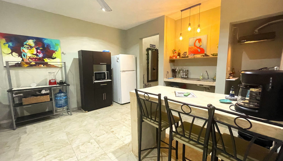 🏠 Espacios interiores pensados para tu confort: La sala conecta con una cocina totalmente equipada 🍳 que incluye estufa/horno de gas, refrigerador, microondas, cafetera ☕ y licuadora, además de una práctica barra de desayuno.
