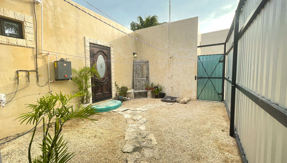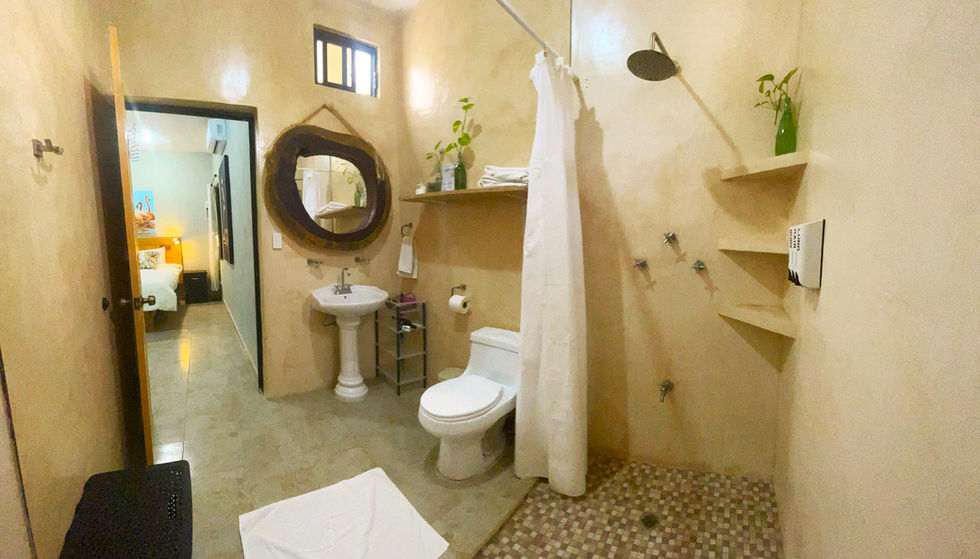 Habitación principal: amplia y tranquila, equipada con cama king size, ventilador, aire acondicionado, clóset, espejo y mesa auxiliar. Tiene acceso directo al patio y un baño amplio y privado con acabados en chukum 🚿✨.