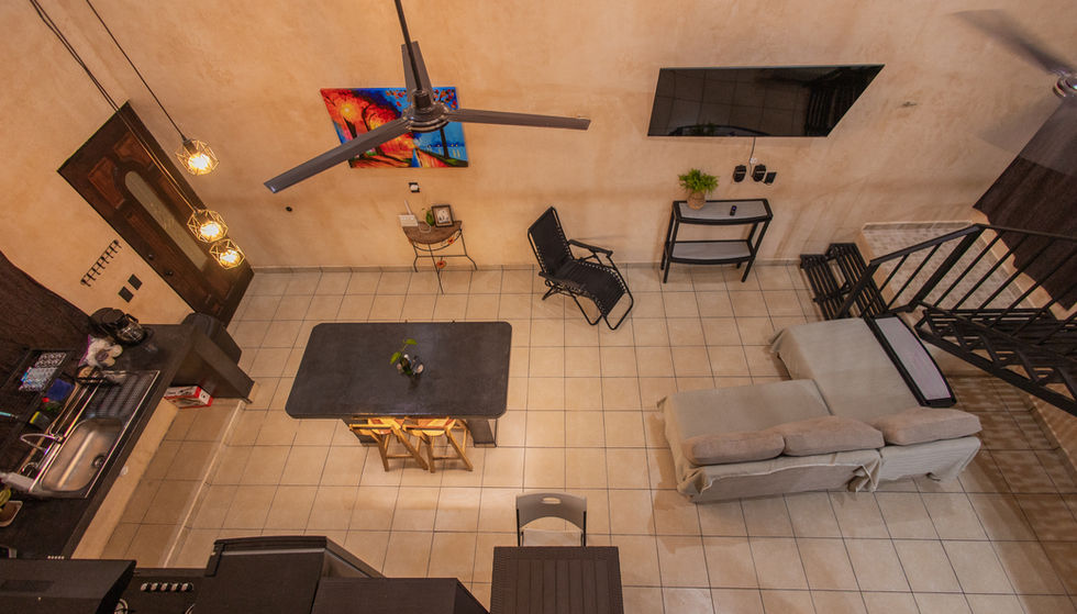 El área de la mesa de comedor está cerca de la puerta del dormitorio y de la escalera de hierro, junto a la sala de estar con un sofá envolvente y un televisor inteligente 4k de 65 pulgadas.