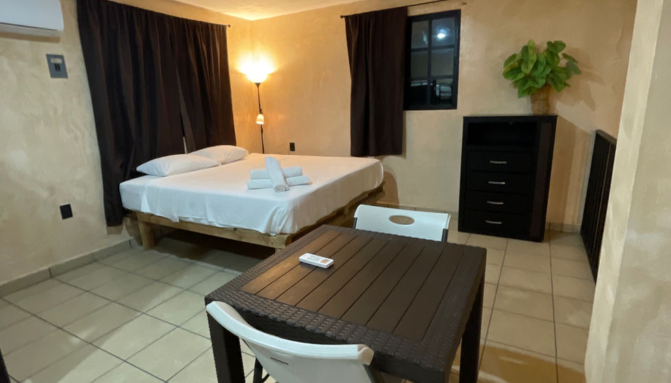 🛏️ Dormitorio principal (planta baja): Cama King size, aire acondicionado, amplio clóset, espejo y baño privado con banco flotante de concreto.
